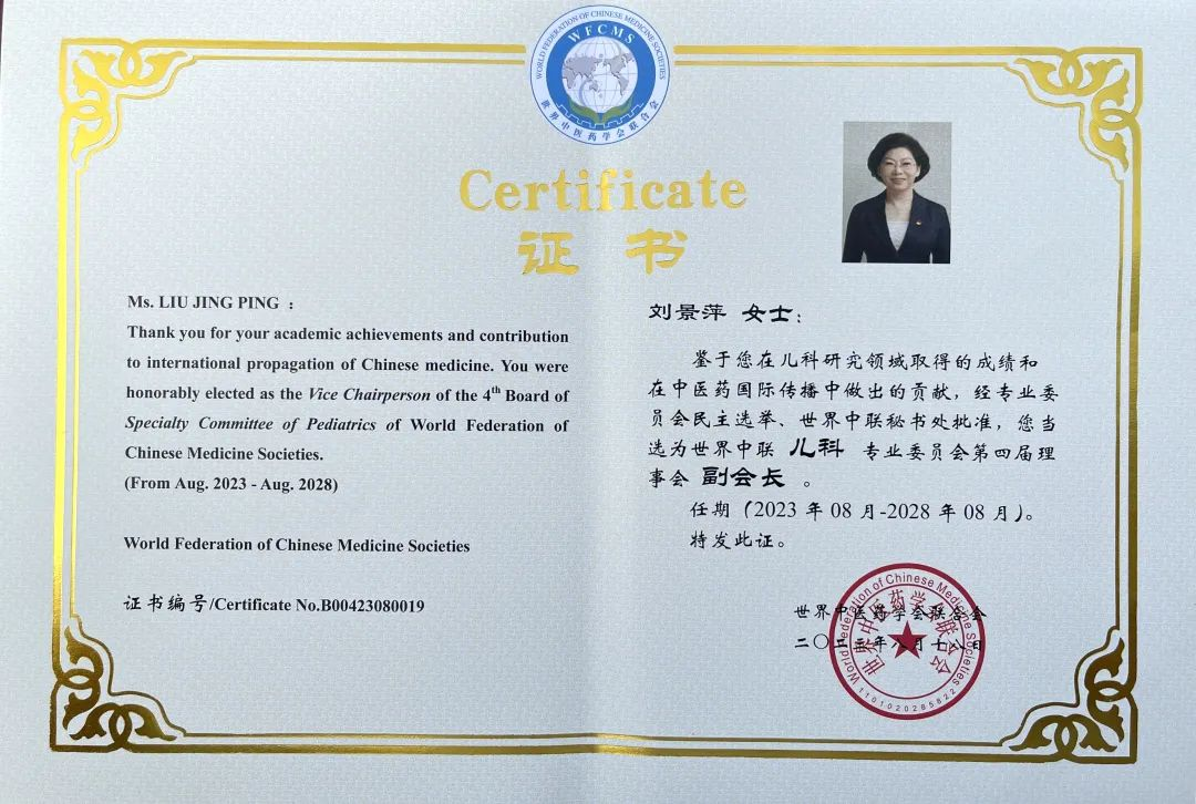 70net永乐高药业集团党委书记、董事长刘景萍当选世界中医药学会联合会儿科专业委员会第四届理事会副会长
